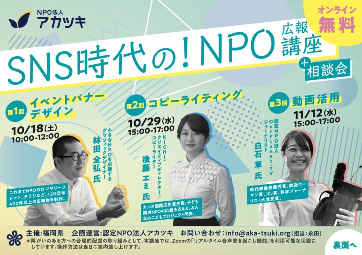 SNS対応を意識した広報活動が、ますます求められる時代になりました。これは、小さなNPOでも、お金をかけずに情報発信ができるチャンスでもあります。講師陣は、いずれもその専門性に加え、NPOの運営や参加の経験がある方々です。当日は講座パートに加え、アカツキ職員のコーディネートによる、合同相談会の時間もしっかり確保します。貴重な機会に、ぜひご参加ください。