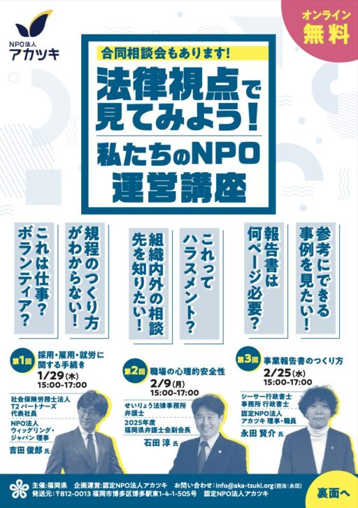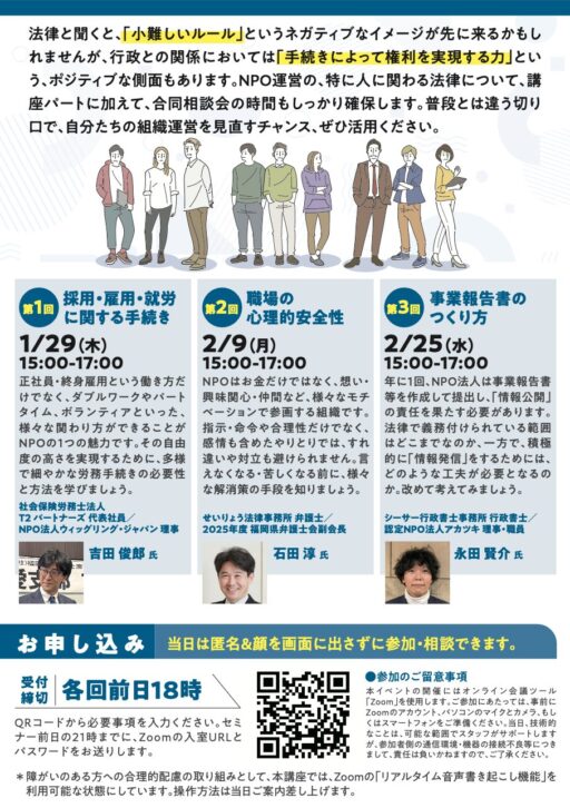法律と聞くと、「小難しいルール」というネガティブなイメージが先に来るかもしれませんが、行政との関係においては「手続きによって権利を実現する力」という、ポジティブな側面もあります。NPO運営の、特に人に関わる法律について、講座パートに加えて、合同相談会の時間もしっかり確保します。普段とは違う切り口で、自分たちの組織運営を見直すチャンス、ぜひ活用ください。
