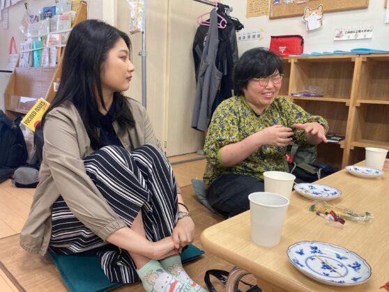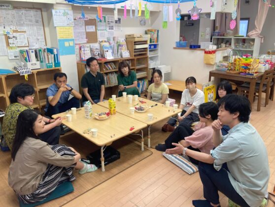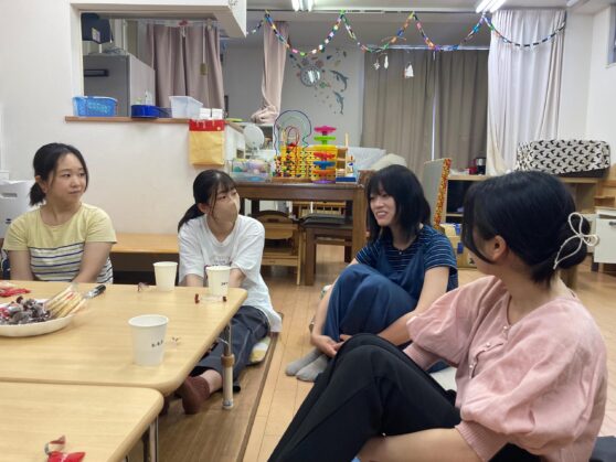『認定NPO法人びーのびーの』さんの、おやこ広場をお借りいただき、明るい雰囲気の中お茶やお菓子も準備してくださいまして、大学教員から現役大学生の理事まで、楽しい雰囲気でそれぞれの言葉を共有し合あうことができたと感じました。