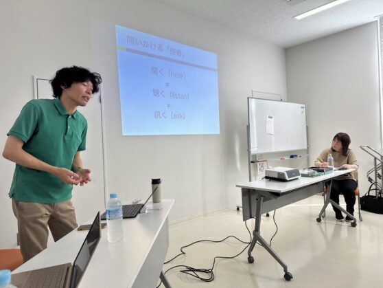 研修の中では、他に、私たちが”訊く力”と呼ぶ、様々な質問の仕方や、言葉と表情や態度のコミュニケーション、誰かを頼る技術、アカツキ自身の取り組み事例などをご紹介しました。途中で、鳥居と永田による、デモンストレーションも挟み、楽しく「あるある」も考えながらの進行でした。